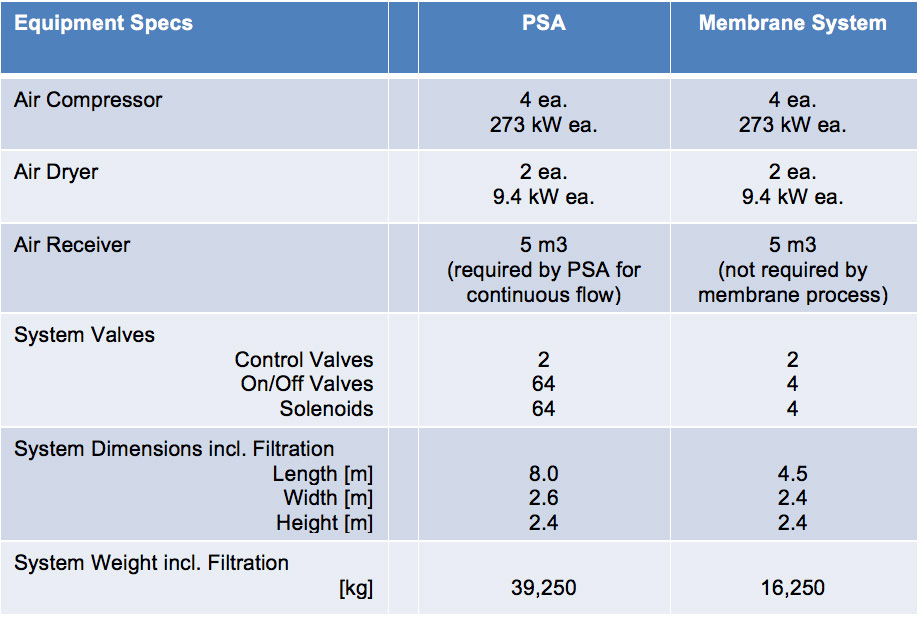 With an identical or slightly lower air consumption over the PSA, the Membrane System uses the identical number of air compressors and air dryers. The air receiver is a luxury for the membrane system, but a necessity for the PSA to buffer the fluctuating air demand. The pre-filtration is identical between the two technologies and port-filtration is not required for the membrane system. Due to the use of an air dryer, both technologies do not require a process heater, which can lead to ground fault alarms onboard ships. With only 4 on/off valves to realize the 2 x 50% split, the membrane system is by far easier to control, operate and maintain if compared to the PSA with 64 valves. - B) Utility Consumption